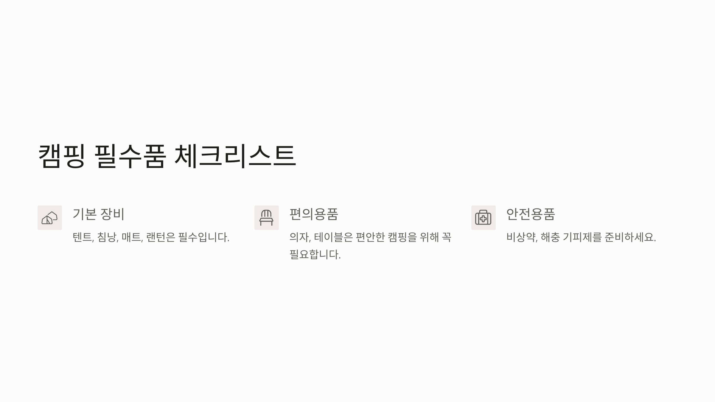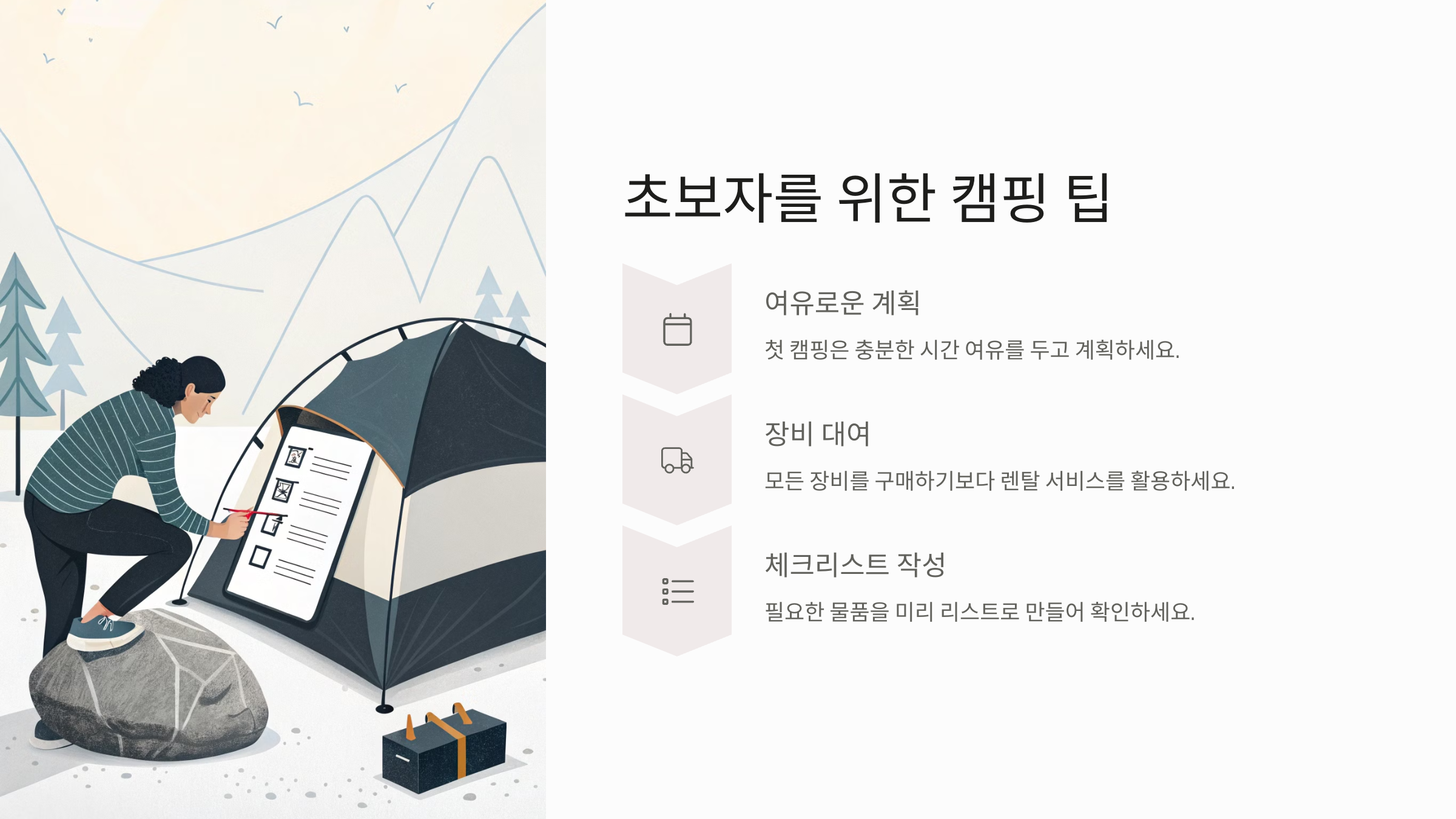 텐트, 랜턴, 침낭, 테이블 등 기본 장비 소개 근거리 오토캠핑장이나 공공 시설 추천 체크리스트 활용 및 렌탈 팁 안내