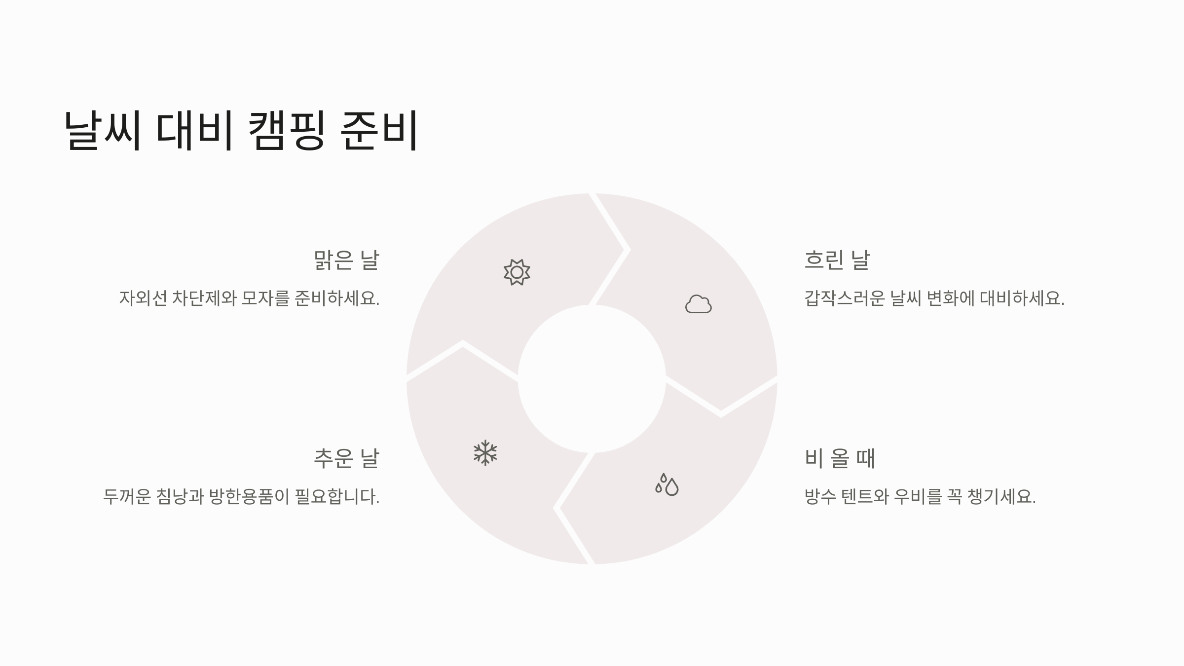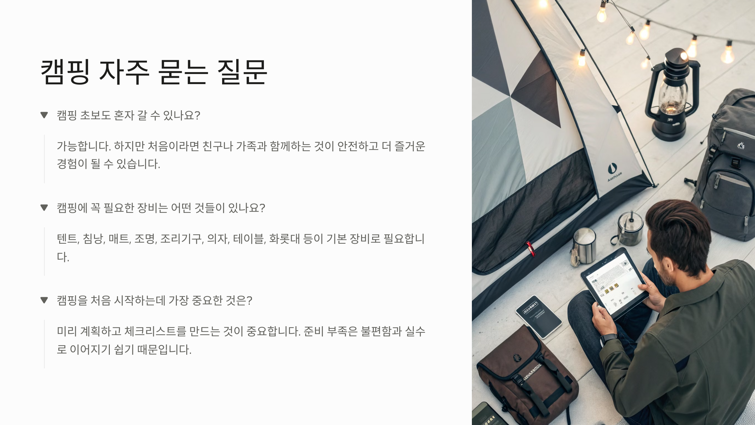 날씨 대비 방수 제품 및 방한용품 준비 자연휴양림과 지자체 캠핑장 예약 정보 소음, 쓰레기 등 캠핑 매너 정보 제공