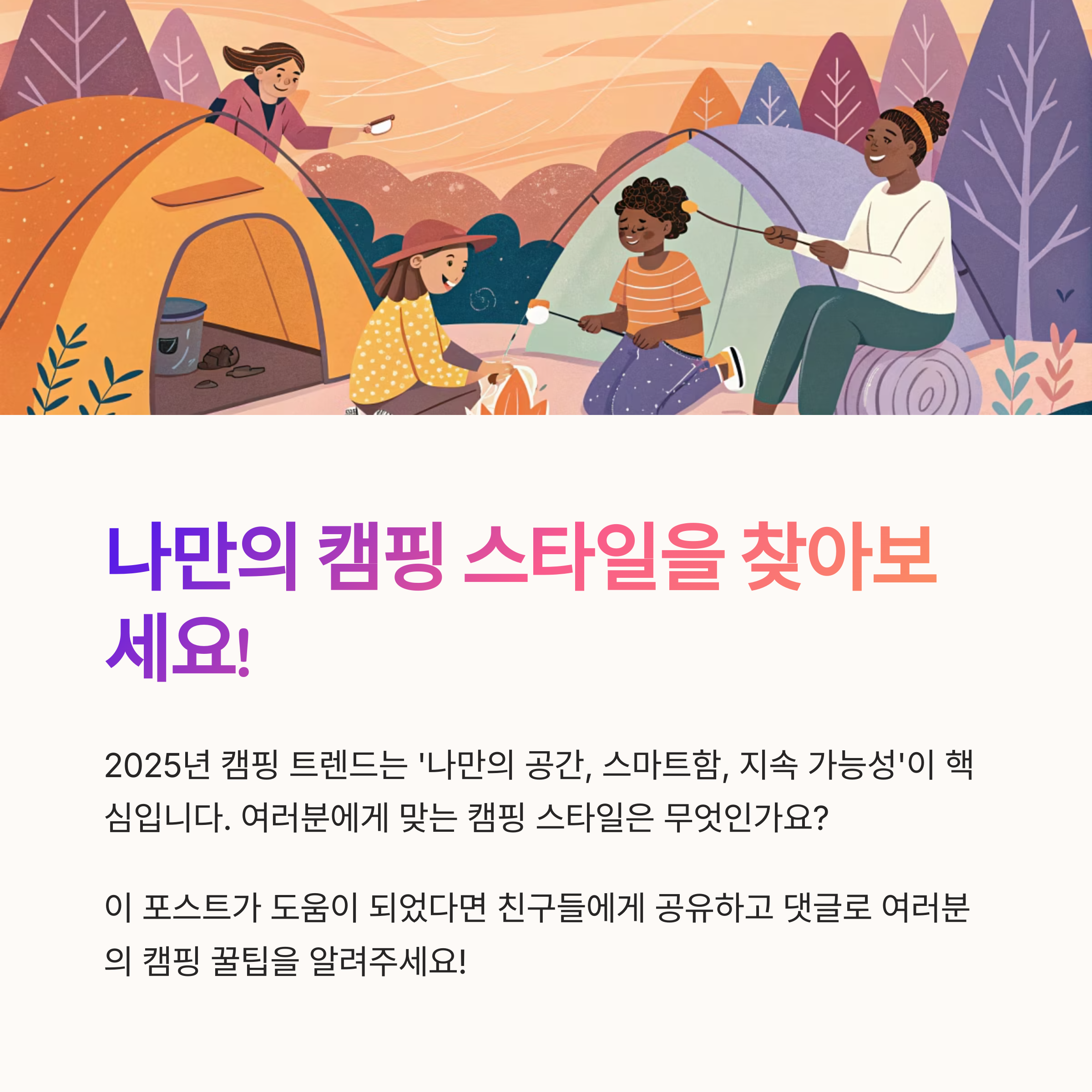 2025년 캠핑 트렌드는 ‘나만의 공간, 스마트함, 그리고 지속 가능성’으로 요약할 수 있습니다. 감성캠핑과 실용성의 조화 속에서, 나에게 딱 맞는 캠핑 스타일을 찾는 것이 중요해졌습니다.
