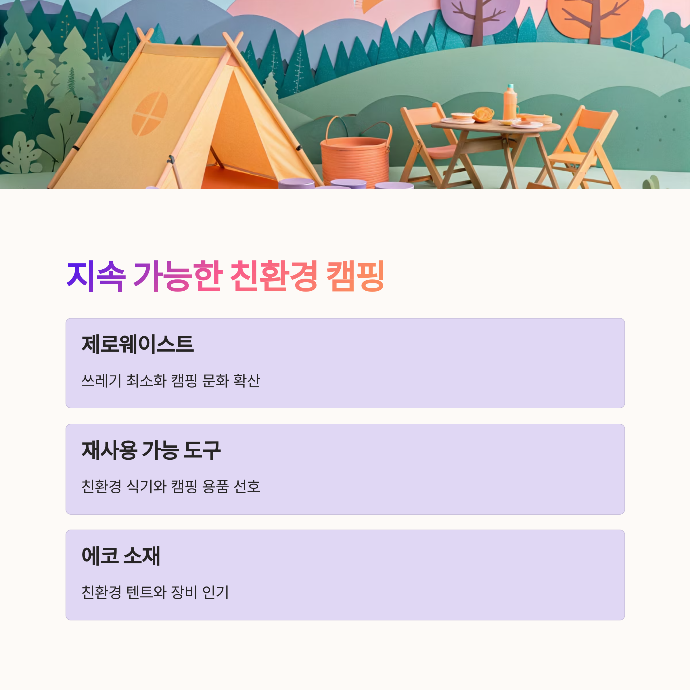 제로웨이스트 캠핑, 재사용 가능한 식기/도구, 친환경 소재 텐트 사용 등 '에코 캠핑'이 새로운 흐름이 되었습니다. 특히, 캠핑장에서 발생하는 음식물 쓰레기 줄이기 캠페인도 확산 중입니다.