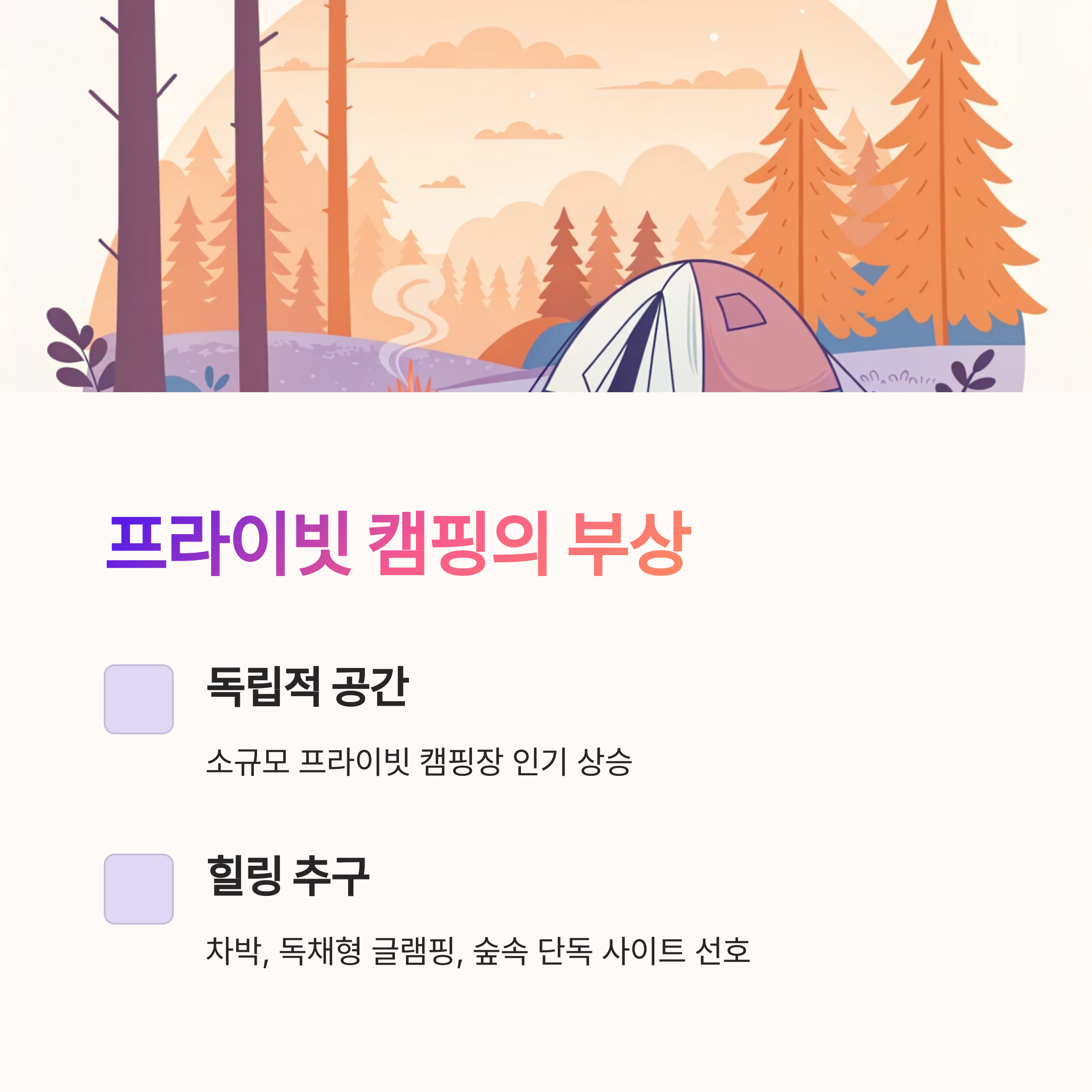 대중과 분리된 독립적인 공간을 추구하는 사람들이 늘면서, 소규모 프라이빗 캠핑장이 주목받고 있습니다. 차박 캠핑, 독채형 글램핑, 숲속 단독 사이트 등이 대표적이며, 조용하고 여유로운 자연 속 힐링을 선호하는 트렌드를 반영하고 있습니다.