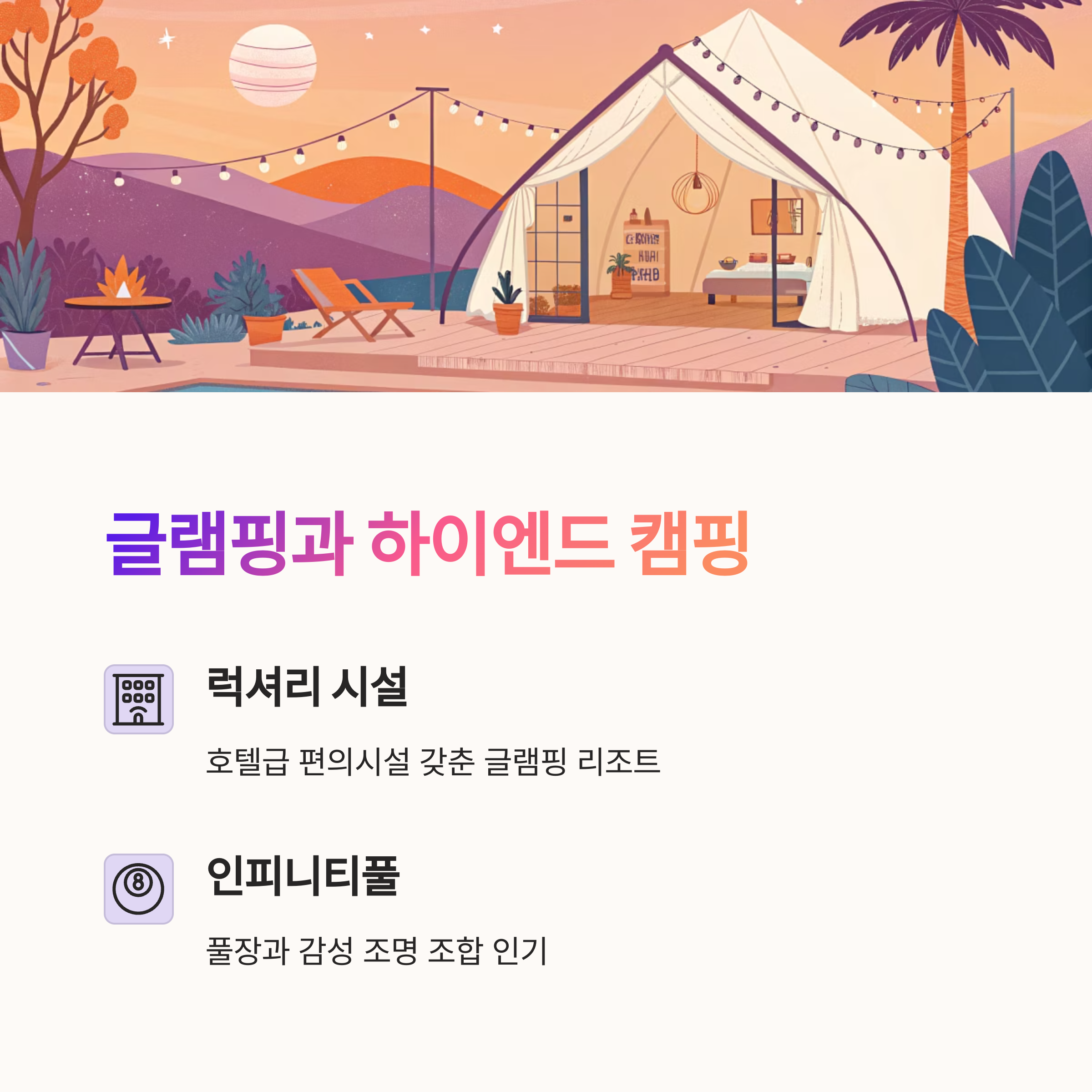 자연 속에서도 호텔급 시설을 원하는 수요가 늘면서, 럭셔리 글램핑 리조트와 프리미엄 전기차 캠핑카 시장이 성장하고 있습니다. 특히 인피니티풀+캠핑, 감성 조명세트 조합이 인기입니다.
