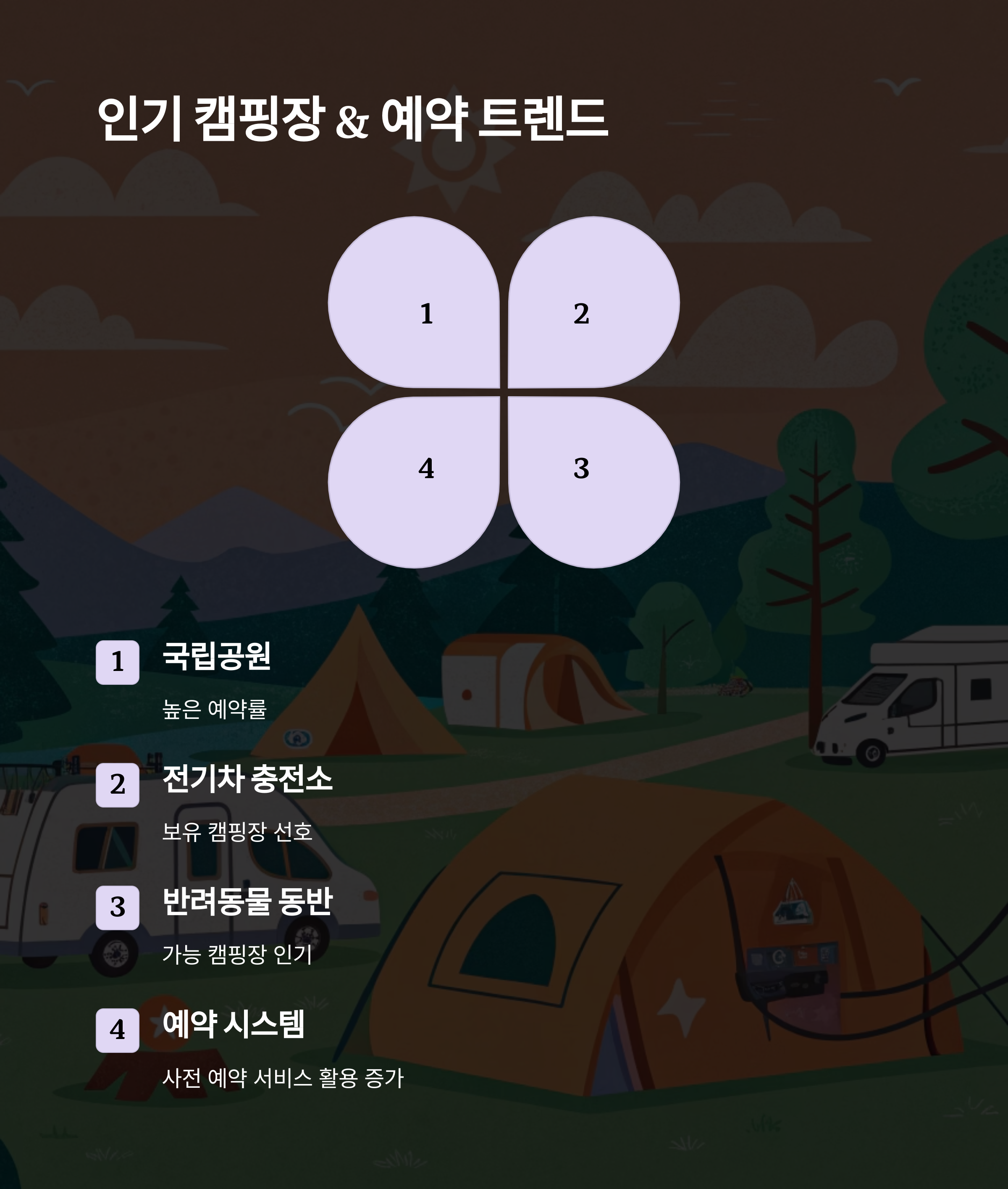 2025년 상반기 기준으로 국립공원 캠핑장, 전기차 충전소 보유 캠핑장, 반려동물 동반 가능 캠핑장이 높은 예약률을 보였습니다. 예약 경쟁이 치열하므로, 사전 예약 시스템, 예약 대행 서비스 활용이 늘고 있습니다.
